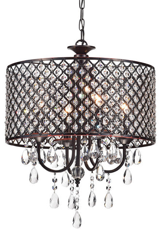 This fixture features a crystal encrusted drum shade, three rows of cascading hanging crystal pendants and a chrome finish. It features a 39.5in adjustable chain that would make it perfect for practically any ceiling height or room size and the 4 light designs ensures that a subtle glow of light is emitted in the room that adds drama and mood lighting. This beautiful chandelier would beautifully adorn any bedroom, living room or bathroom with ambiance, light and style that captures the eye no matter what angle you look at it. Ceiling Fixture dimensions: 17in W x 17in H or 20in H with crystal hanging Suggested room size: 200 - 360 sqft Chain length: 39.5in; Can be shorter by removing some links Takes four (4) max 60-watt candelabra (E12) bulbs (not included) Dimmable with dimmer switch and right type of bulbs UL Listed Style: Drum, Modern/Contemporary Fixture finish: Chrome Suggested Room...
